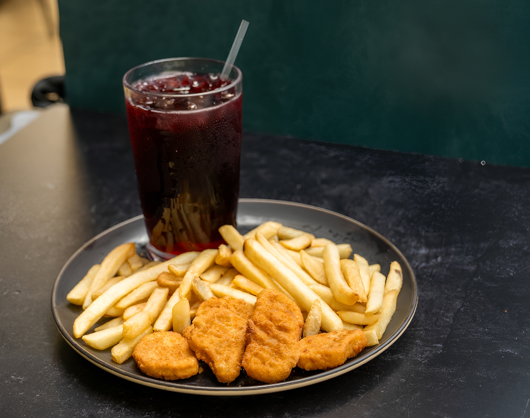 10 year old and under. Chicken Nuggets on a bed of French Fries. Ketchup on the side.