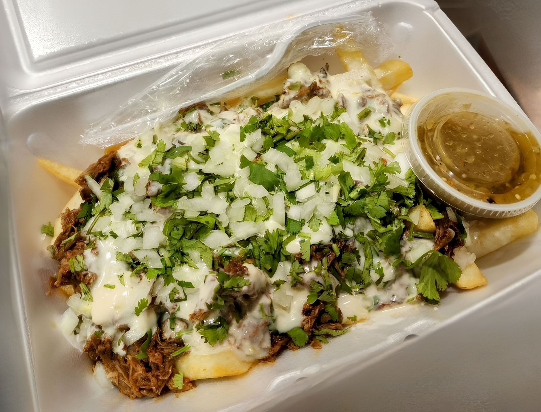 Takozz Meat Fries - Crispy French Fries, topped with choice of protein, Sauced with white queso, finished with fresh cilantro, crisp onions and choice of salsa.