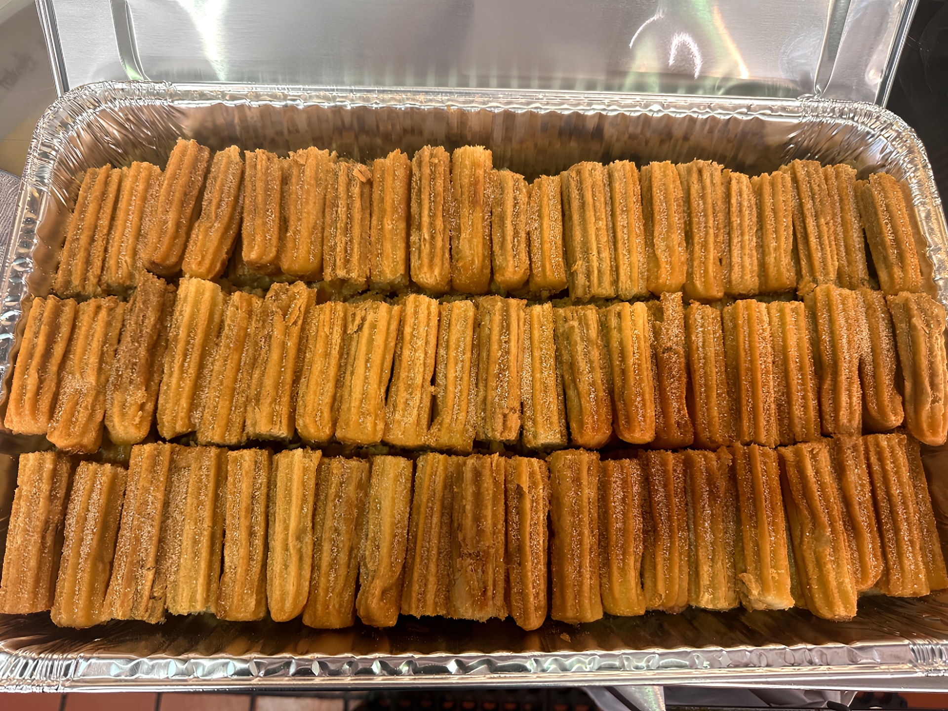(Must be ordered 24hrs in advance) Full Size Tray Of Churros (15 Servings) Comes with Bottle Of Caramel For Drizzle Or Sauce & a Can of Whipped Cream.
