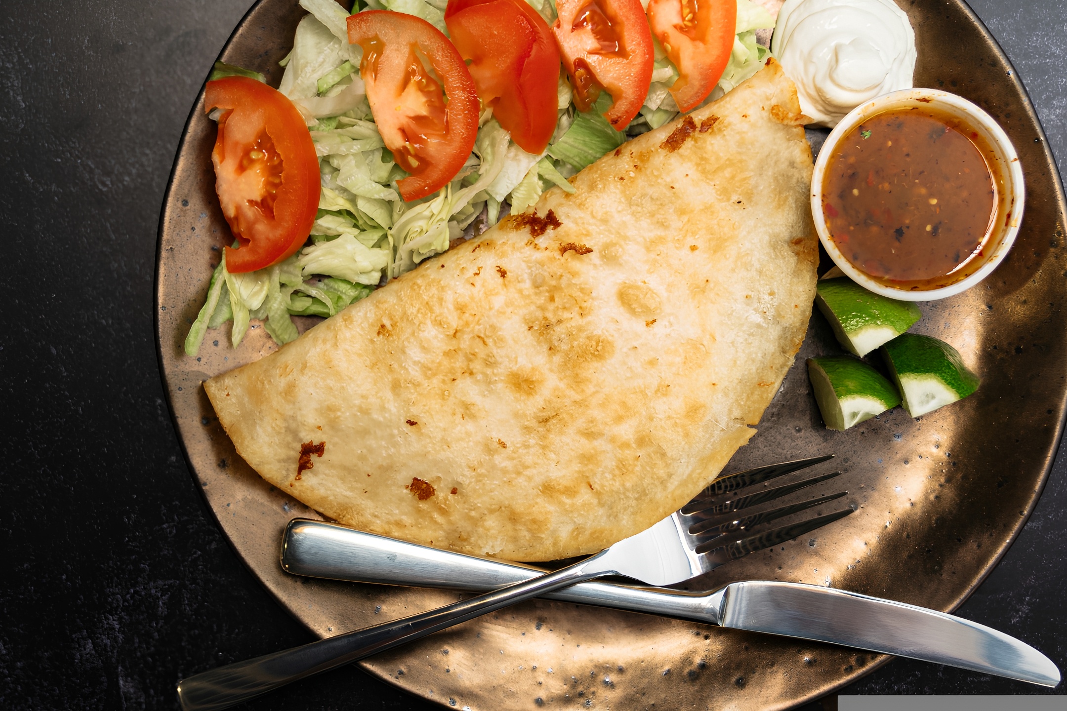 8" flour tortilla, loaded with cheese, and your choice of delicious protein, folded in 1/2. **Served with French Fries and a fresh salsa all on the side**.