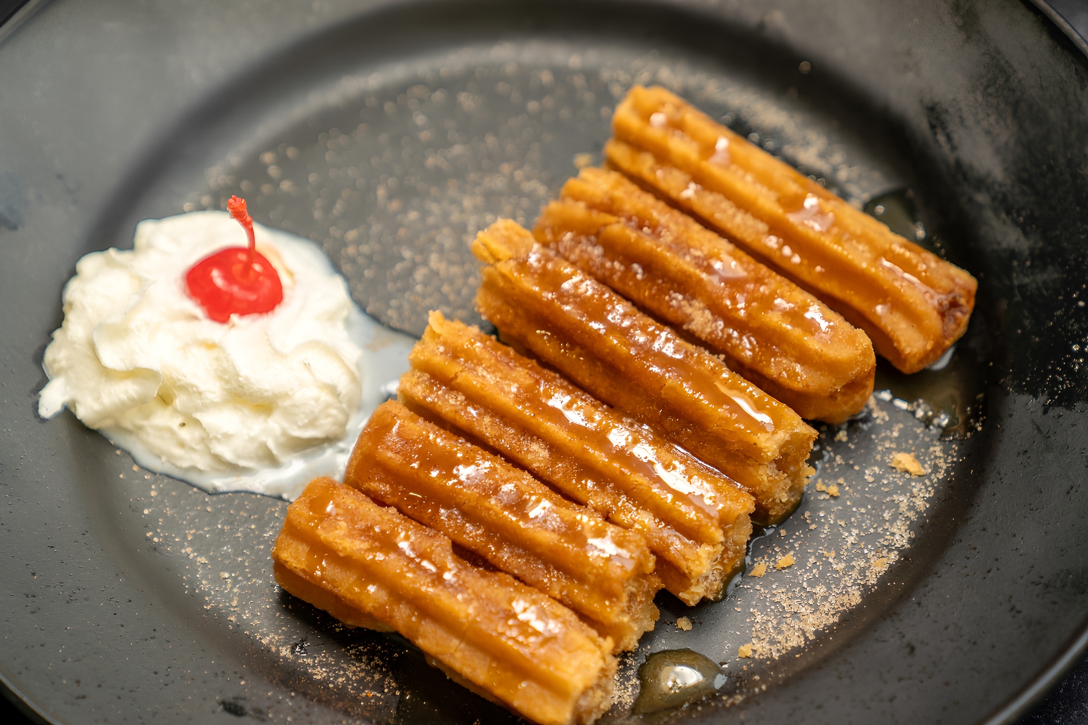 Our community favorite! Mexican pastry deep-fried dusted slightly with sugar/cinnamon mix, filled with cajeta then glazed with caramel sauce. Paired with whip cream and a sweet cherry. Extra toppings for an additional charge.