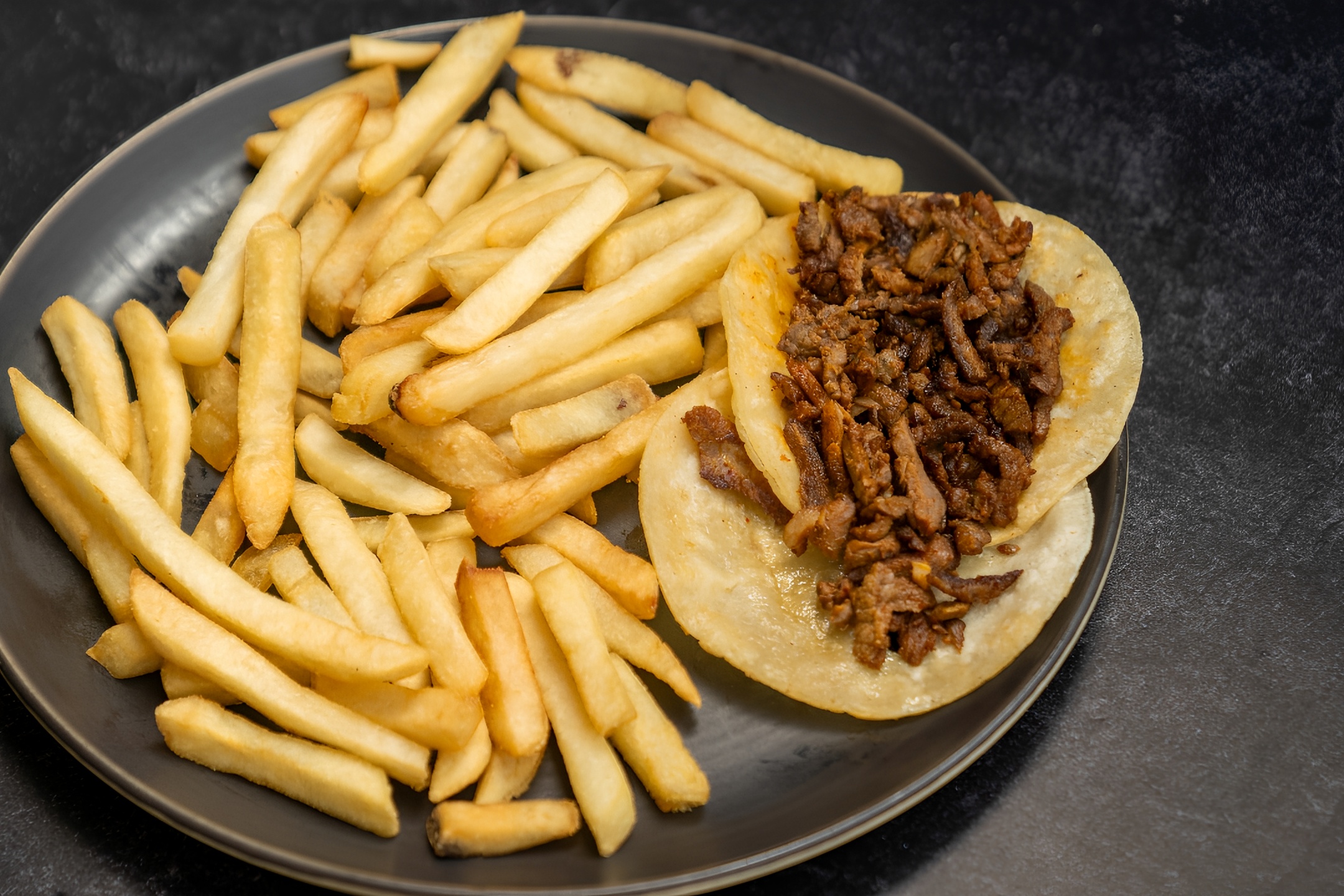 8" flour tortilla, with cheese, and your choice of 2 delicious protein, folded in 1/2. **Served with French Fries and a fresh salsa all on the side**.