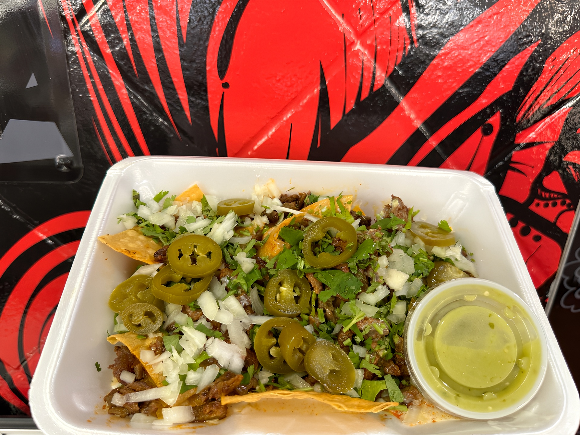 Takozz Nachos - Crispy Homemade Tortilla Chips, topped with choice of protein, Sauced with white queso, finished with fresh cilantro, crisp onions and choice of salsa. Feel Free to Add Other Toppings.