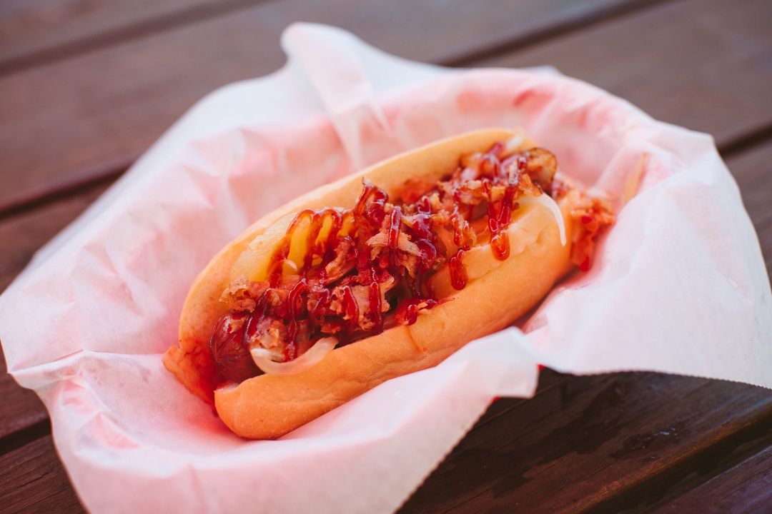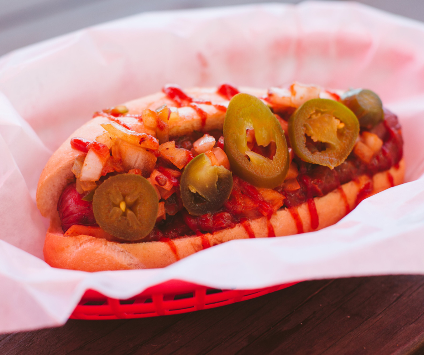 Smoked dog topped with spicy relish, chipotle onions, molotov sauce and sriracha
