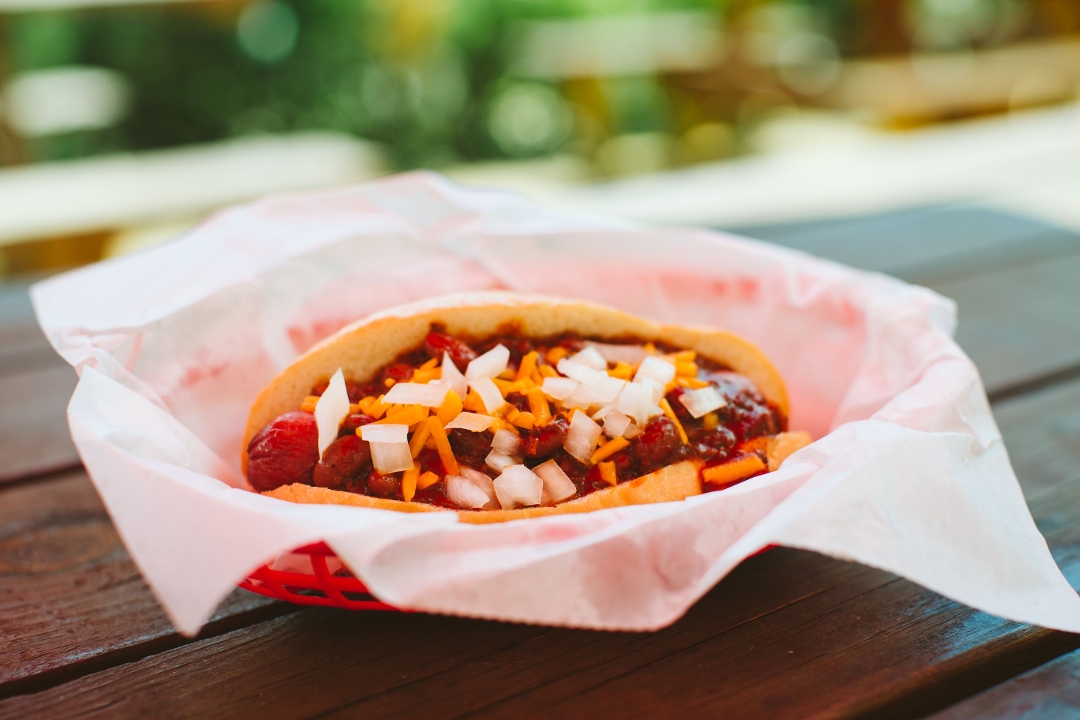 Grain-based hot dog with house-made vegan chili, vegan shredded cheddar and choice of raw, grilled, fried or chipotle onions