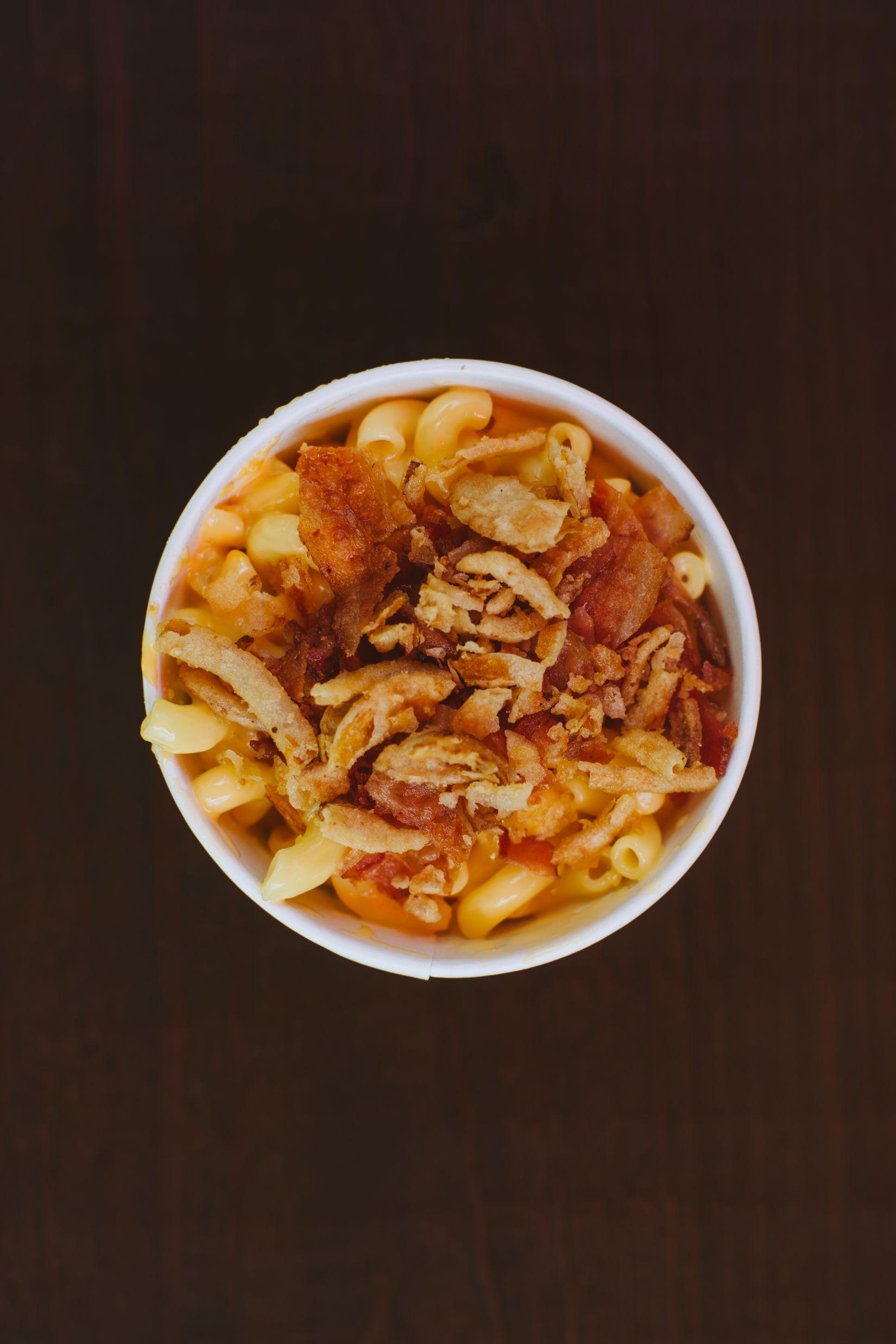 House-made mac and cheese bowl topped with bacon and crispy fried onion.
