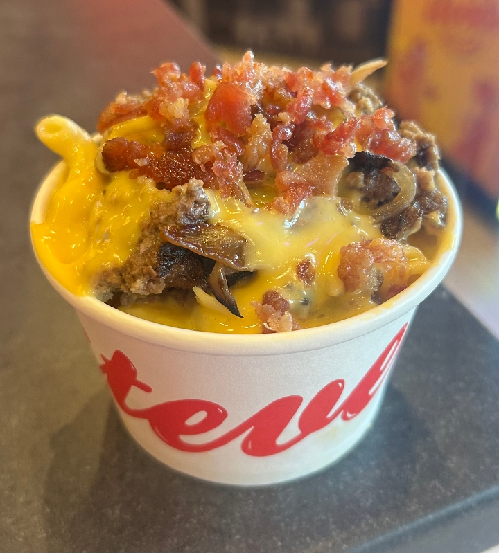 House-made mac and cheese bowl topped with burger crumbles, grilled onions and chopped bacon.