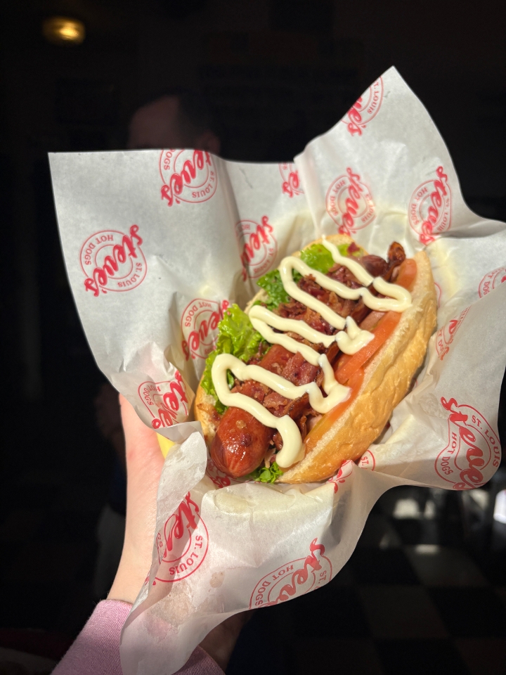 Our smoked dog with bacon strips AND chopped bacon, lettuce, tomato slices and mayo.