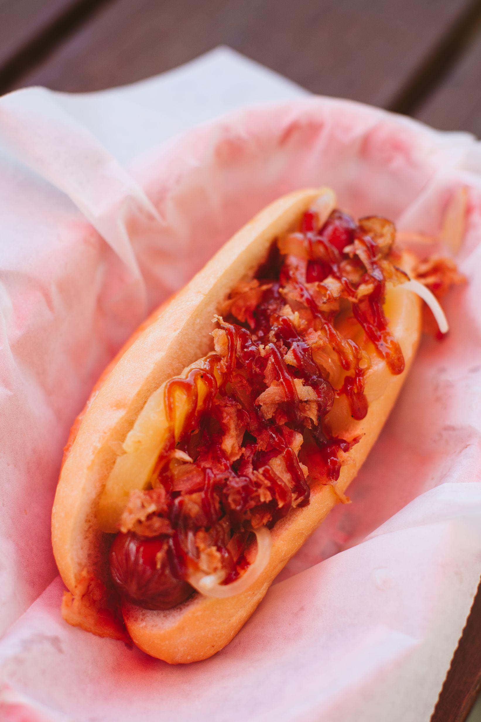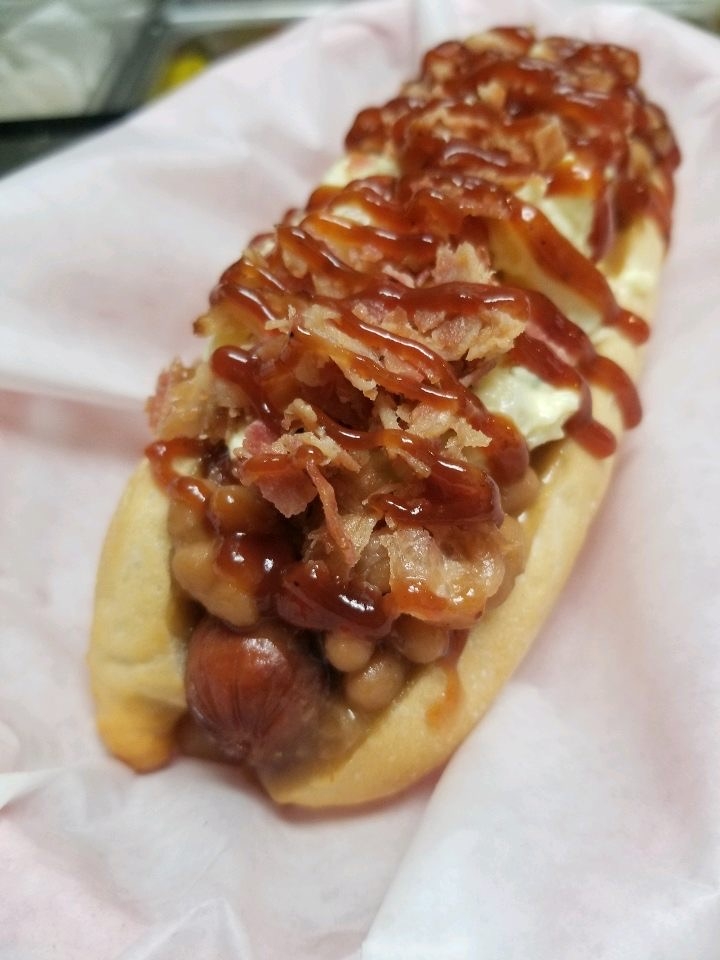 Our smoked dog with sliced pineapple, grilled onion, chopped bacon, and Sweet Baby Ray's BBQ sauce.