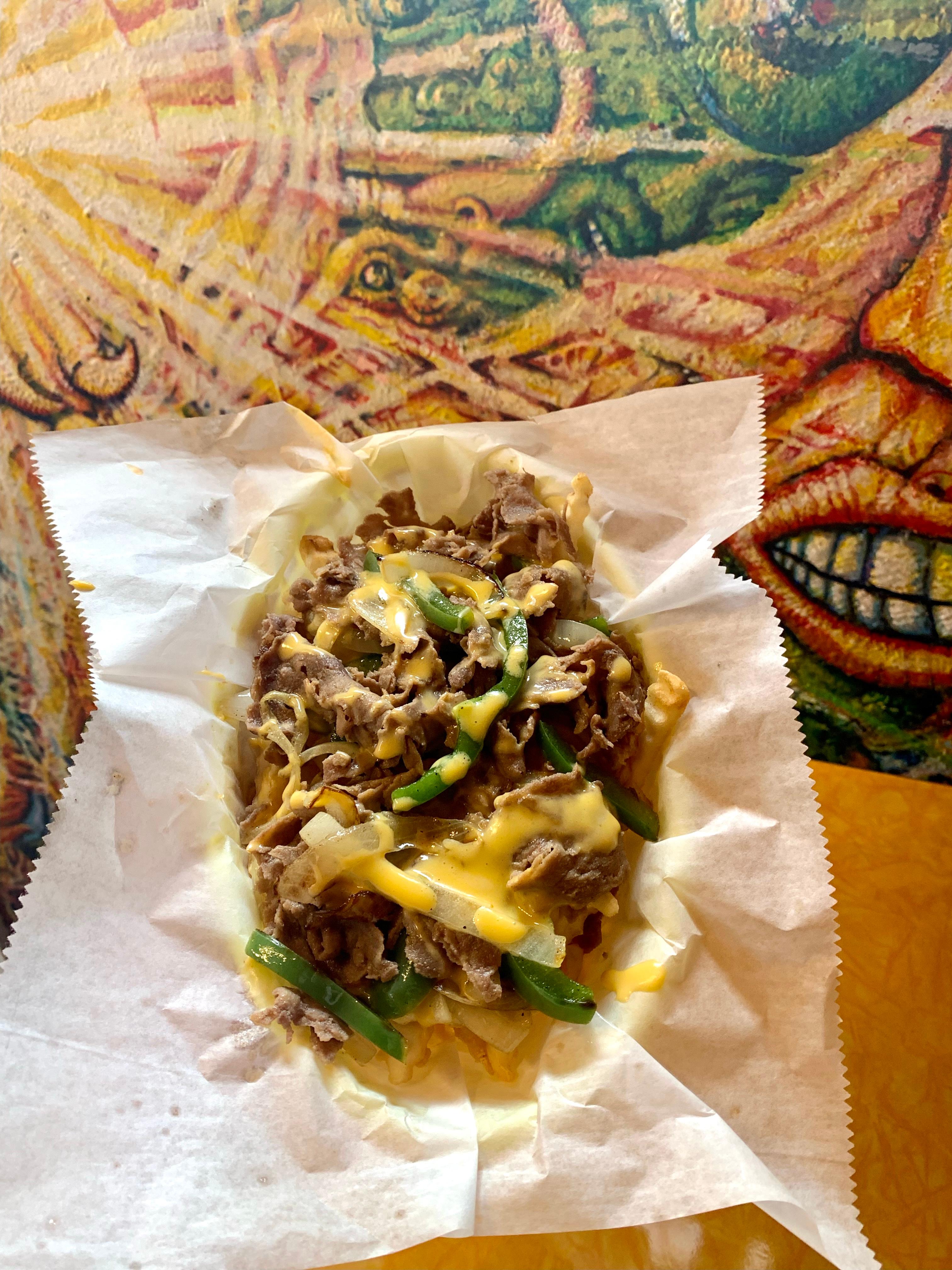 Crinkle cut fries topped with cheese sauce, Philly meat, grilled peppers and grilled onions