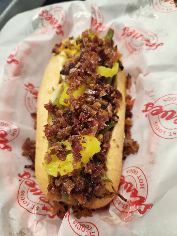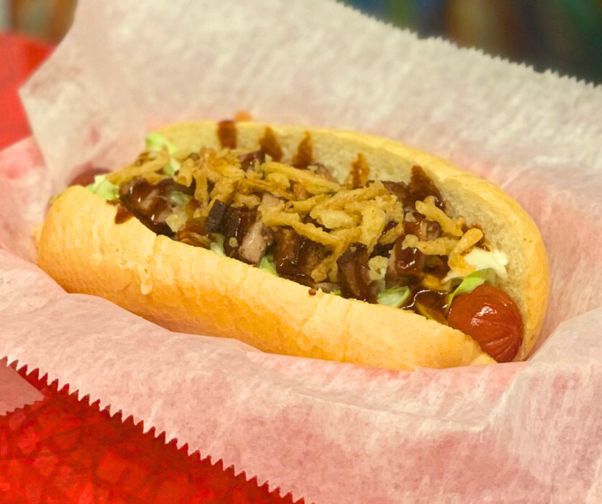Our smoked dog with pepper jack, jerk seasoning, bell peppers, and Honey Chipotle BBQ. Topped with a double serving of chopped bacon.