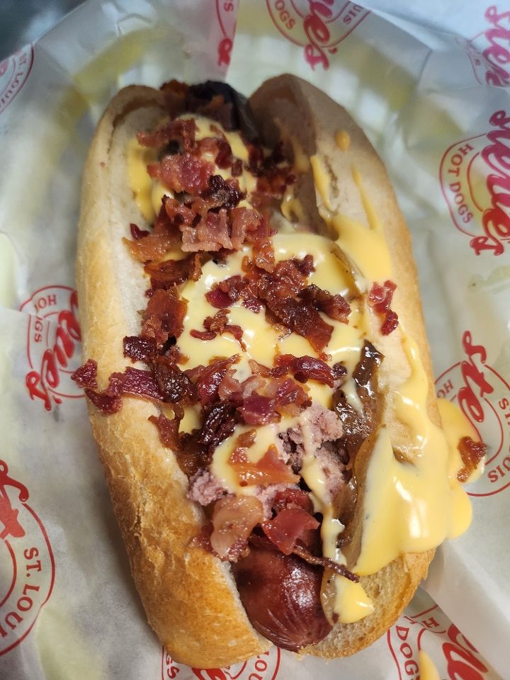 Smoked dog, topped with ground beef, bacon, cheese sauce, and grilled onions.