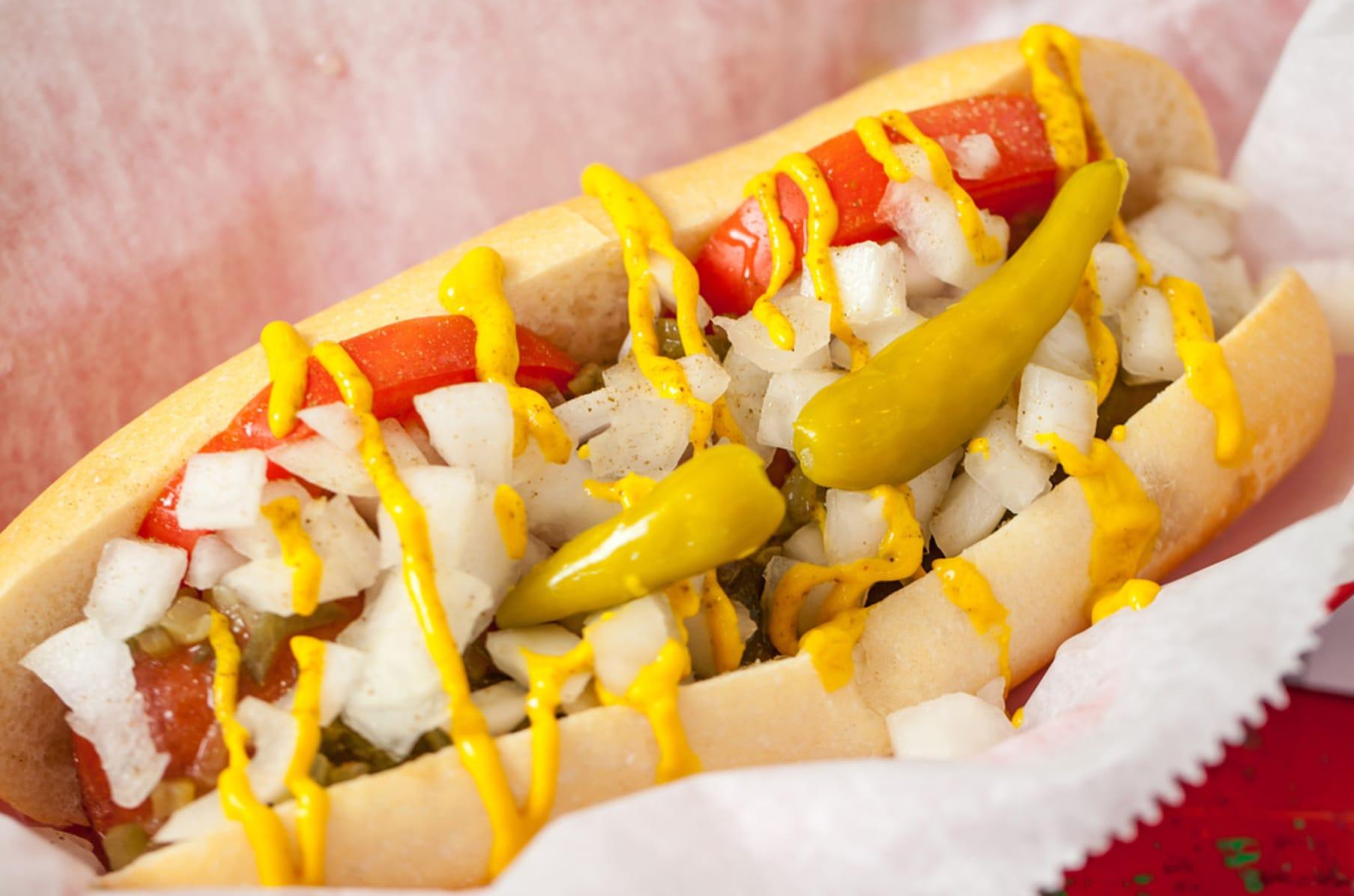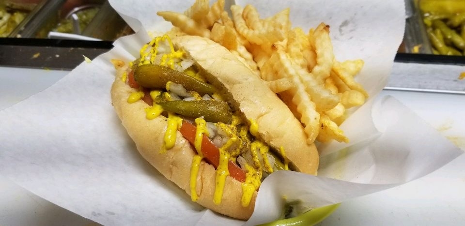 Spicy Version of the Chicago Dog. We swap in our spicier ingredients - sweet-hot relish, spicy brown mustard, chipotle onions, jalapeno peppers, tomato, pickle and sport peppers.