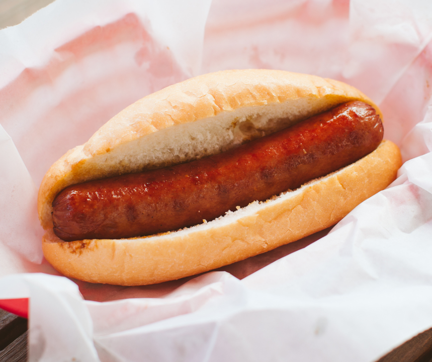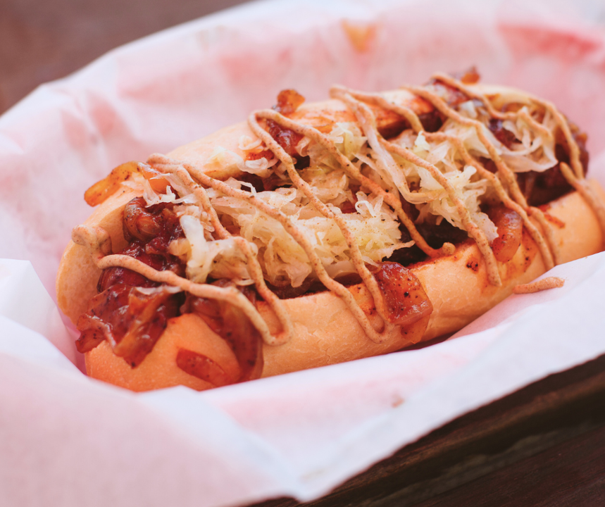 Our New York Style hot dog with sauerkraut, New York grilled chili onions, celery salt, and brown mustard.