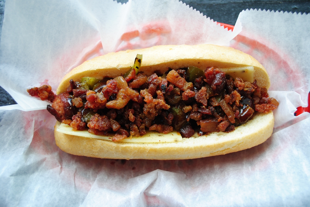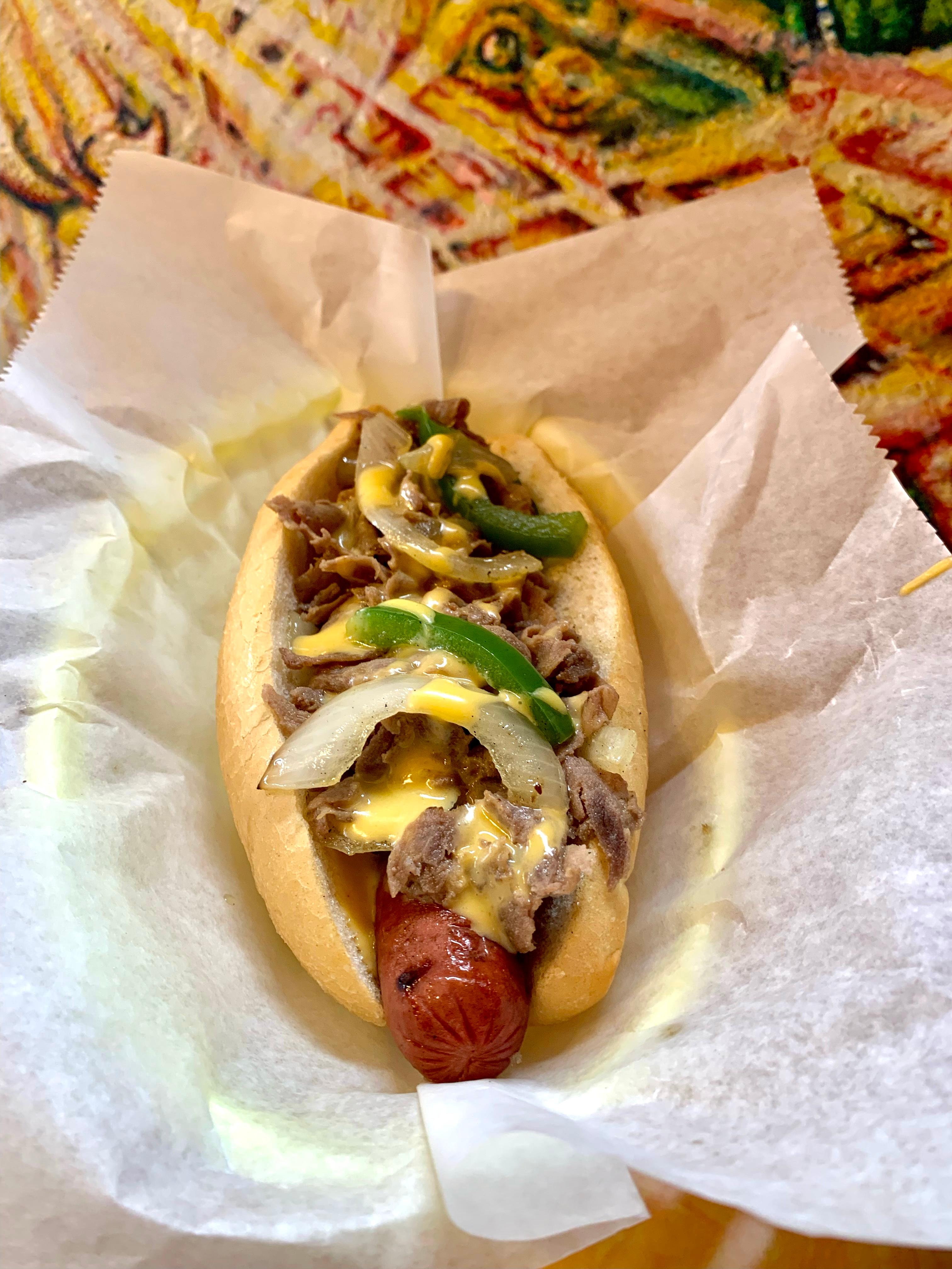 Smoked dog with Philly meat, grilled peppers and onions and covered in cheese sauce