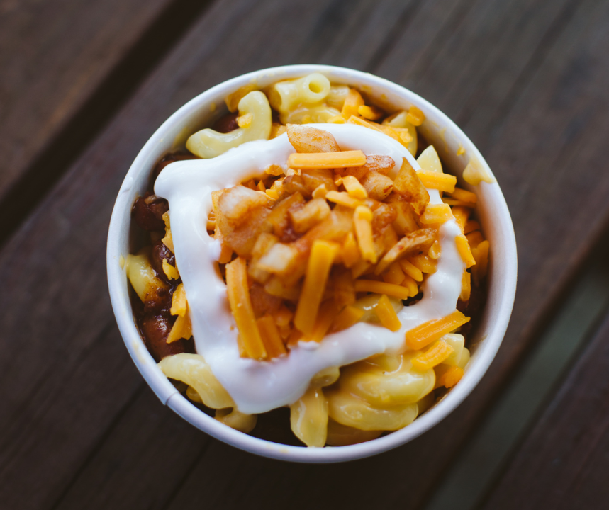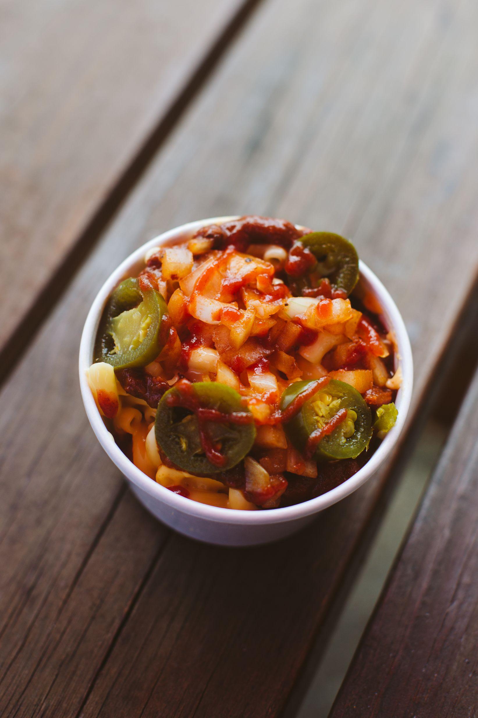 The real deal chili mac for ya. Our mac and cheese covered with piping hot chili, shredded cheddar, with your choice of raw, grilled, chipotle or fried onions and sour cream.