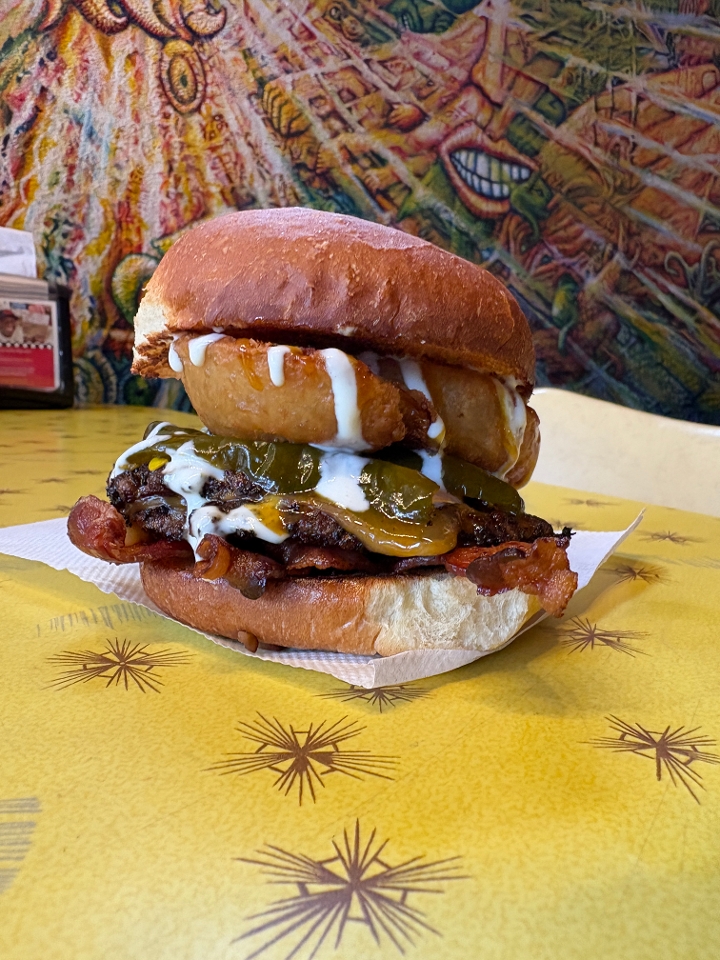 Double smashburger with smoked gouda, bacon strip, candied jalapenos, whiskey battered onion rings, ranch and golden mustard sauce.