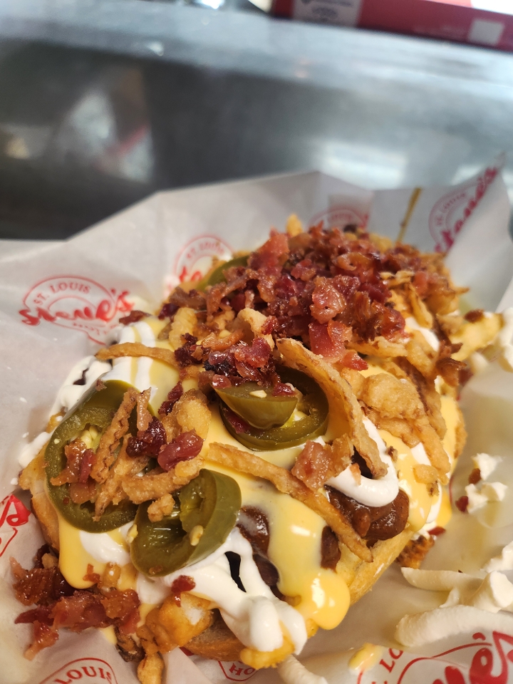 Our take on a Central Illinois favorite. A hot dog topped with a pile of burger crumbles and then topped with fries, cheese sauce, chili, sour cream, fried onions, bacon and jalapeños. Hope you came hungry!