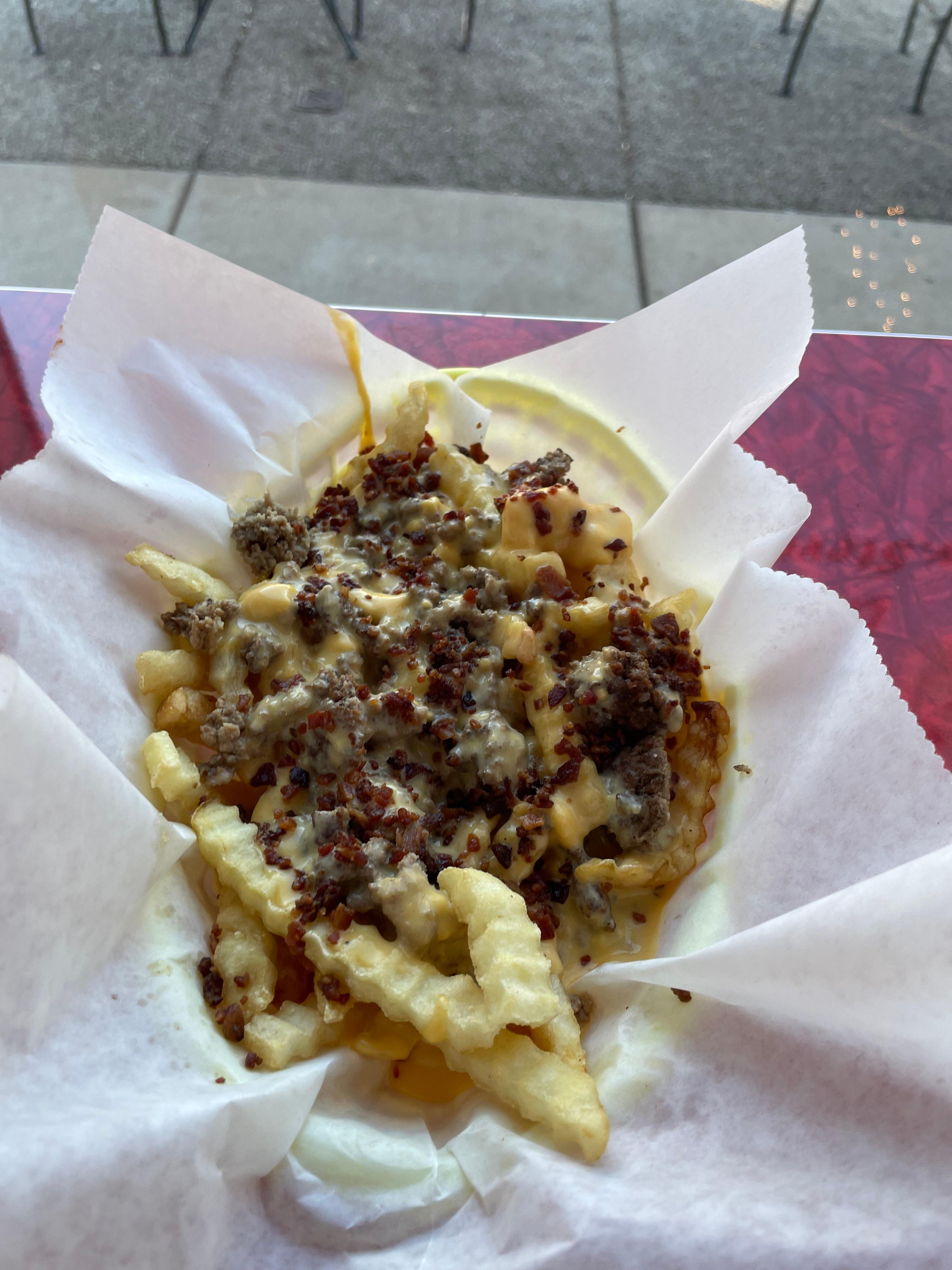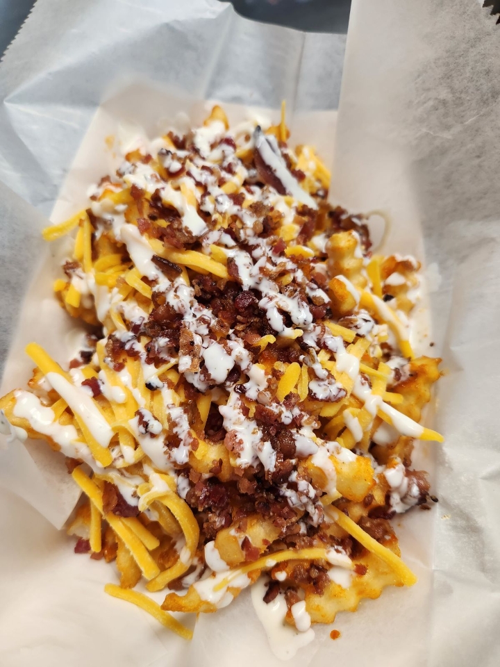 Crinkle fries topped with ground beef, bacon, and creamy cheese sauce.