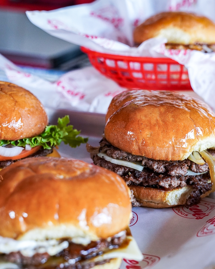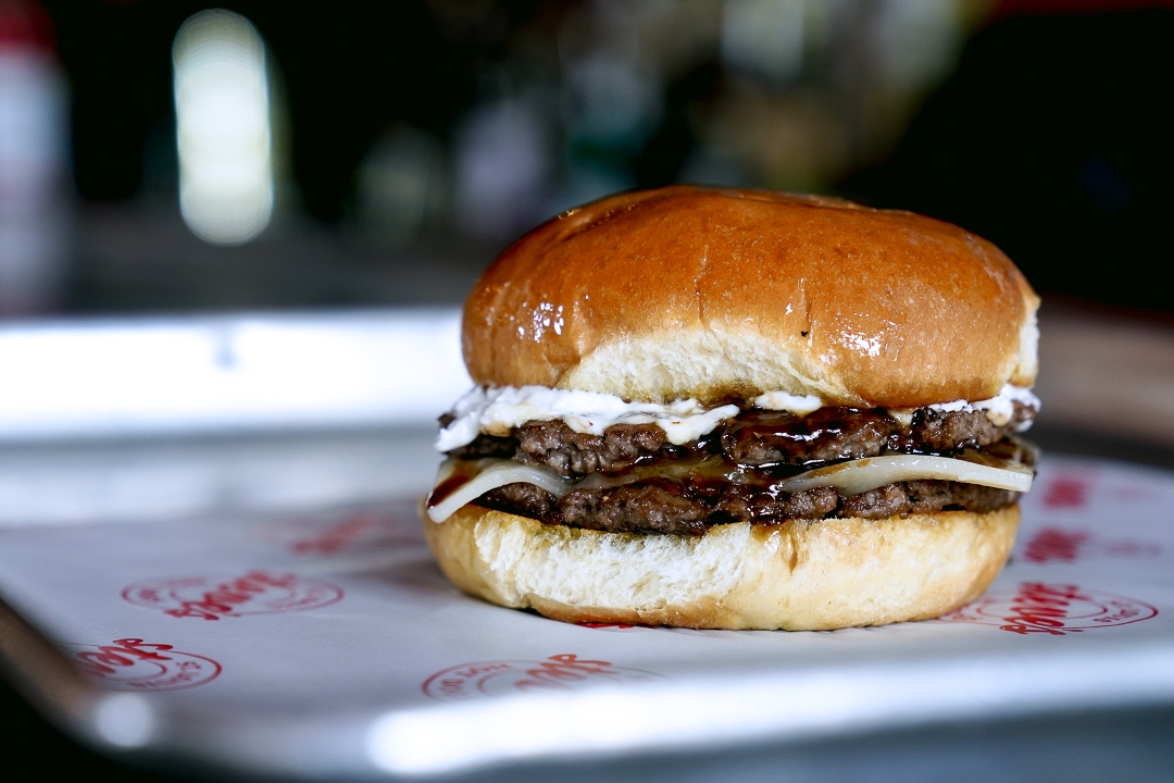 Double smashburger w/ American cheese, lettuce, pickle, tomato, raw onions, ketchup, mayo & mustard.