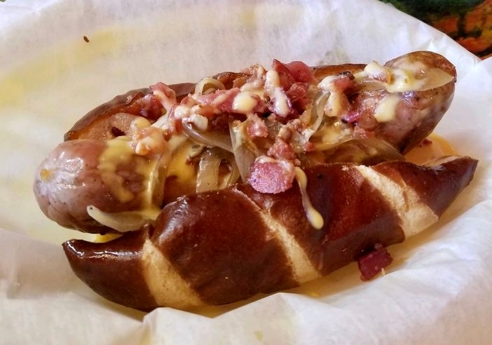 A grilled G&W Bratwurst with creamy cheese sauce, grilled onions and crumbled bacon on a pretzel bun