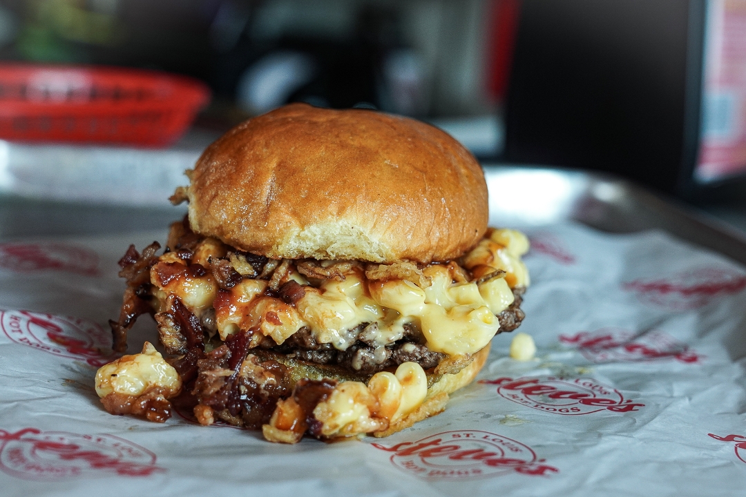 Double smash burger w/ Steve's creamy macaroni & cheese, fried onions, bacon & Sweet Baby Ray's BBQ sauce.