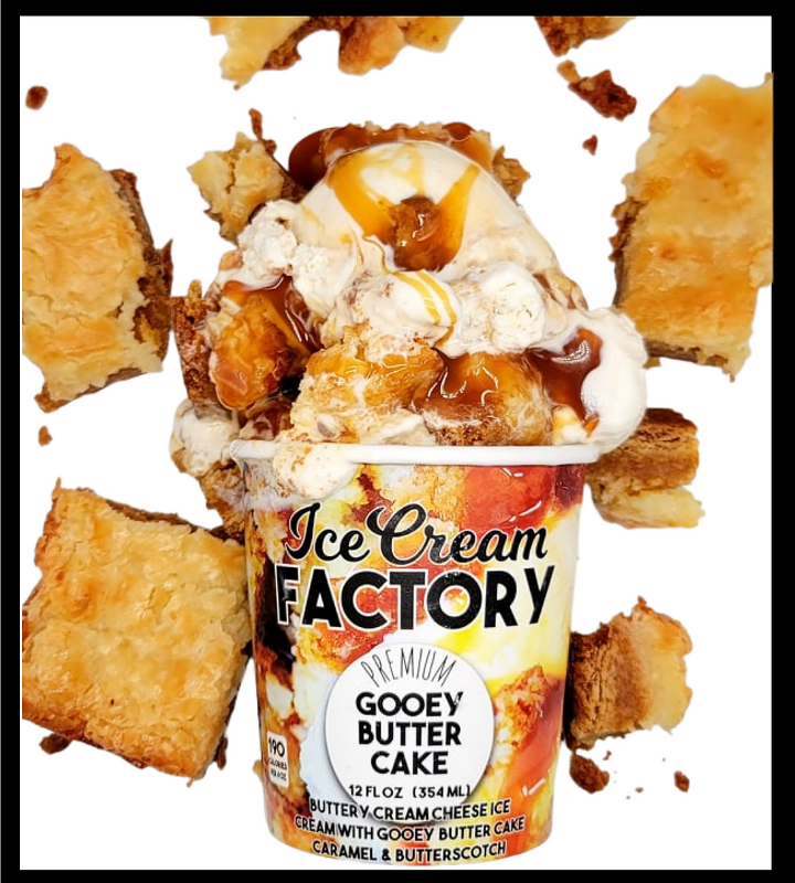 Buttery cream cheese ice cream with gooey butter cake, caramel and butterscotch