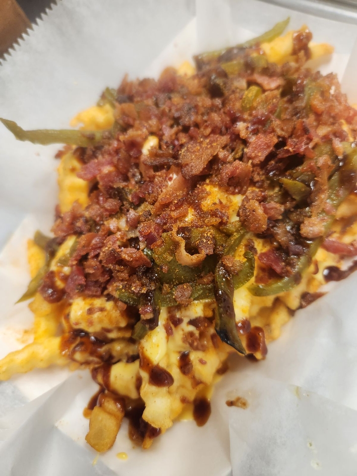 Crinkle fries tossed in jerk seasoning and then covered with cheese sauce, our signature Honey-Chipotle sauce, grilled bell peppers, and chopped bacon.