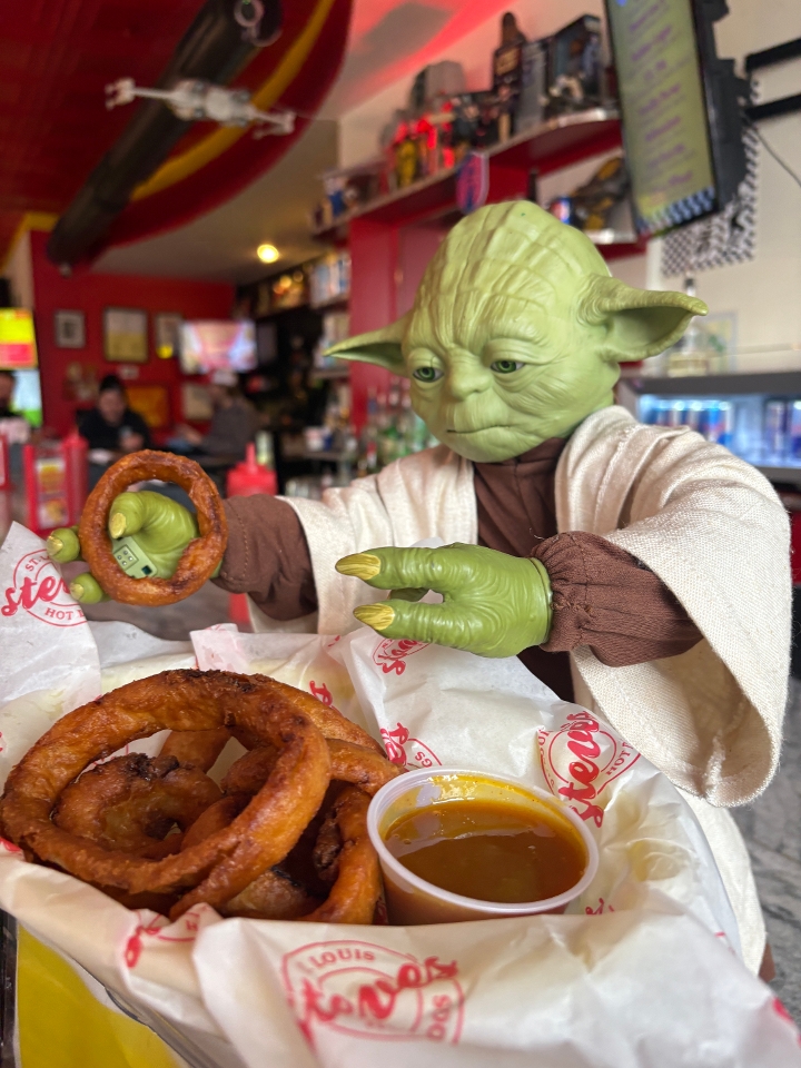 Dog smothered in chili, topped with shredded cheddar and your choice of raw, sauteed, chipotle or fried onions.