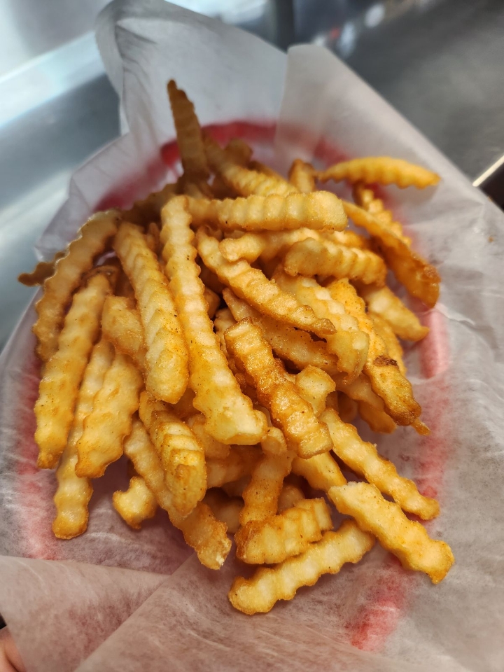 Crinkle fries topped with shredded cheddar, garlic cream cheese, honey chipotle bbq sauce and bacon.