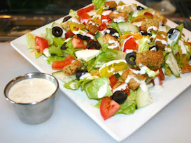 Fresh romaine lettuce, cheddar cheese, tomatoes, cucumbers, banana peppers, black olives, and garlic croutons. Standard Dressings: Italian Vinaigrette
