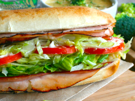 Freshly sliced ham, gluten free smoked turkey, and provolone topped with lettuce, tomato and mayo on your choice of white or wheat bread.