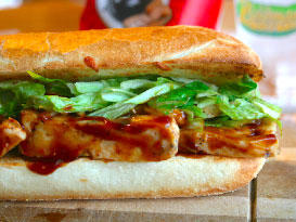 BBQ Chicken Sandwich Grilled chicken strips topped with provolone, lettuce,and Kansas City BBQ sauce on your choice of white or wheat bread.