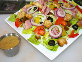 Salami, capicola, smoked ham, shredded mozzarella, tomato, giardiniera peppers, banana peppers, onions, black olives, and garlic croutons. Standard Dressings: Mustard Vinaigrette