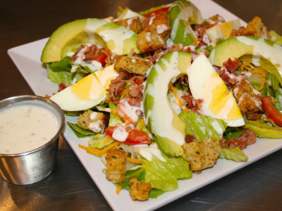 Fresh romaine lettuce, sliced avocado, crumbled bacon, hard-boiled egg, tomatoes, cheddar cheese & garlic croutons. Standard Dressings: Classic Ranch / Low-Fat Ranch