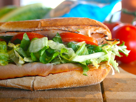 Hickory smoked turkey breast and provolone dressed with lettuce, tomato, and mayo on your choice of white or wheat bread. +Suggest Adding Avocado for .99