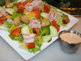 Romaine lettuce, turkey breast, smoked ham, shredded cheddar cheese, diced tomatoes, sliced cucumbers, and garlic croutons. Standard Dressings: Chipotle Ranch