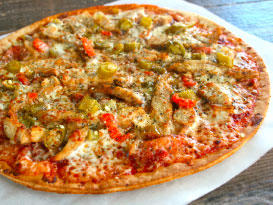 Grilled chicken, pepperoni, sausage, giardiniera peppers, onions and marinara sauce on our perfectly toasted thin crust.