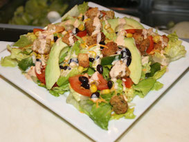 Fresh romaine lettuce, avocado, black beans, corn, red onions, tomatoes, green peppers & cheddar. Try this with salad with Spinach for a SUPER FOOD SALAD! Standard Dressings: Chipotle Ranch